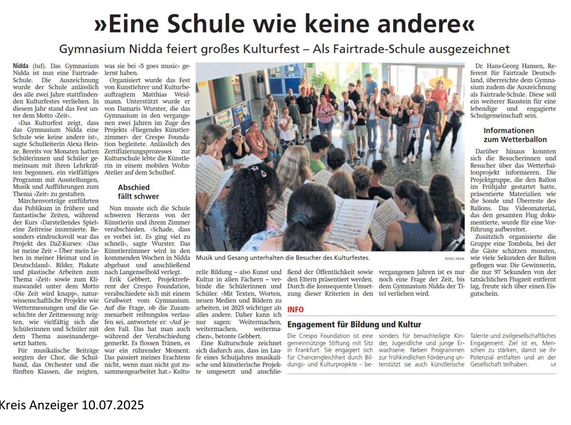 Mit dem Thema „Zeit“ beendete das Gymnasium Nidda das Schuljahr am 03. Juli mit einem großen Kulturfest. Schüler und Lehrer bereiteten in vielen Wochen ein buntes Programm vor: Ausstellungen, Livemusik und Aufführungen zum Thema „Zeit“ zeigten, wie kreativ und einfallsreich die unterschiedlichsten Zugänge zu einem Begriff ausfielen, der unseren Alltag so maßgeblich bestimmt- insbesondere zum Ende eines arbeitsreichen Schuljahres. So entführten Märchenvorträge die Zuhörer in alte und fantastische Zeiten, mit einer Zeitmaschine konnte man sich auf verrückte Reise begeben und der Kurs Darstellendes Spiel nahm das Publikum ebenso mit auf eine Zeitreise. Besonders fiel das Projekt des DaZ- Kurses „Das ist meine Zeit - Über mein Leben in meiner Heimat und in Deutschland“ aus, aber auch Bilder, Plakate und plastische Arbeiten zum Thema Zeit sowie Themen wie Klimawandel unter dem Motto „Die Zeit wird knapp“ und naturwissenschaftliche Projekte wie Wettermessungen und aus der Physik die Geschichte der Zeitmessung verdeutlichten, wie unterschiedlich die Schüler sich mit dem Begriff beschäftigten. Für eine spontane Überraschung sorgten die jungen Sportler mit einem fulminanten Tanzauftritt. Zahlreiche Eltern nutzten den späten Nachmittag, um zu sehen, was ihre Kinder im vergangenen Schuljahr auf die Beine gestellt hatten. Eine besondere Rolle spielte dabei Damaris Wurster, die die Schule mit ihrem „Fliegenden Künstlerzimmer“ in den letzten zwei Jahren mit unzähligen Projekten und Angeboten begleitet und geprägt hat. Im Rahmen der Zertifizierung als Kulturschule lebte Wurster in einem mobilen Wohn- Atelier auf dem Schulhof des Gymnasiums Nidda. Ziel ist die Verankerung von künstlerischer Praxis im Schulalltag und somit die Förderung kreativer Herangehensweisen an unterschiedliche Aufgaben, was für die Zukunft der Schüler immer wichtiger wird. Mit tollen Erinnerungen, aber auch großem Bedauern verabschiedete die gesamte Schulgemeinde Wurster, die Nidda samt „FliKü“ mit Auslaufen des Projektes verlässt. Besondere Freude bedeutete hingegen die Auszeichnung des Gymnasiums Nidda als Fairtrade-Schule, welche ein weiterer Baustein in einer lebendigen und aktiven Schulgemeinde ist. Untermalt wurde das Fest von musikalischen Beiträgen des Chores, der Schulband, des Orchesters und die 5. Klassen zeigten, was sie im Rahmen des Musikkonzepte „5 goes music“ gelernt haben. Schulleiterin Alexa Heinze freute sich über die große Resonanz, da das Kulturfest ein besonderer Baustein im Programm für kulturelle Schulentwicklung ist, und bedankte sich ganz besonders herzlich bei den Eltern, die das Schulfest kulinarisch unterstützten.