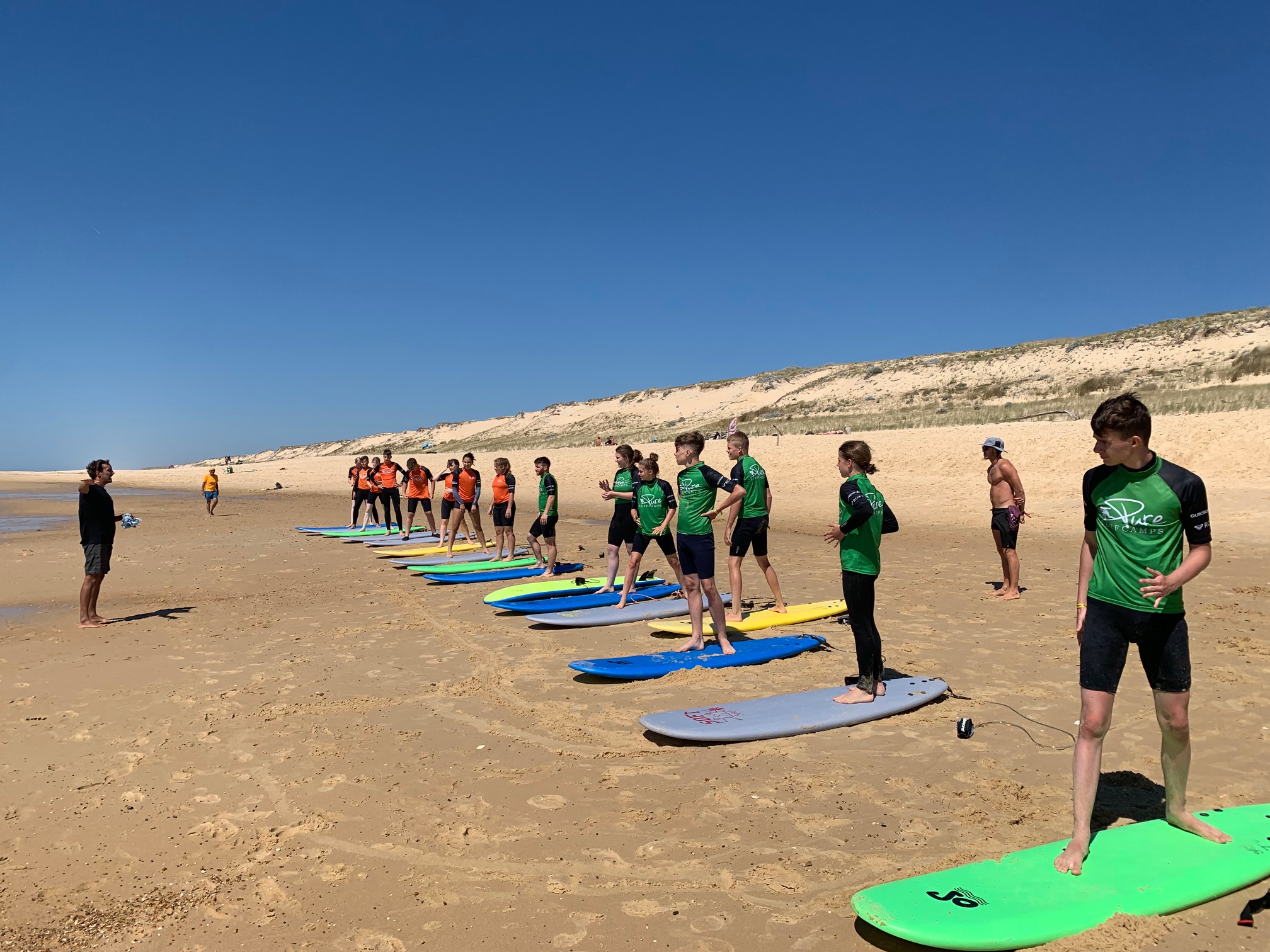 Für die zwei Sportklassen der Jahrgangsstufe 8 und die ehemalige Sportklasse der Jahrgangsstufe 9 fielen in den letzten beiden Jahren - pandemiebedingt - die traditionellen Skifreizeiten aus. Dies wollte unser Sportlehrer Philipp Kalbfleisch so nicht hinnehmen und organisierte für die Schülerinnen und Schüler der Profilklassen ein Alternativangebot. Vom 7. bis zum 14. Juli 2022 nahmen erstmalig über 70 Schülerinnen und Schüler des Gymnasiums Nidda die sportliche Herausforderung an und lernten an der französischen Atlantikküste Wellen zu reiten.