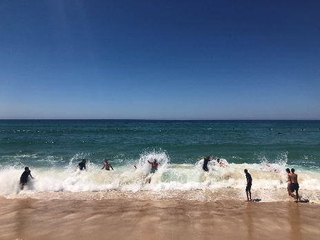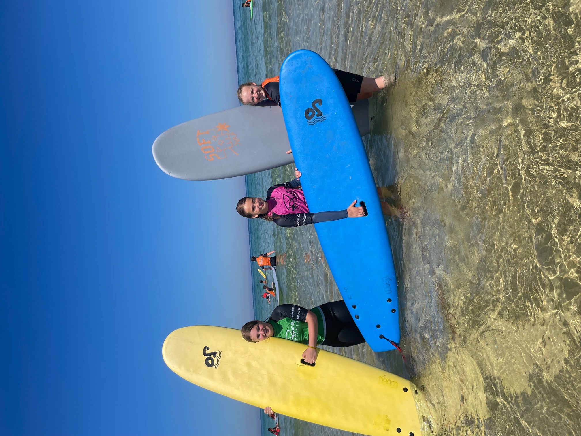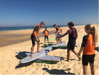 Der Atlantik bietet beste Bedingungen für Anfänger: da die Wellen am Strand brechen, landet man sanft im Sand! Das Surfen wurde uns nicht nur in der Praxis auf den Wellen beigebracht, sondern auch in der Theorie. Zertifizierte Surfguides erteilten uns Theoriestunden, in denen sie uns über die Gefahren von Strömungen aufklärten und uns die verschiedenen Arten von Wellen und deren Einflüsse auf das Surfen erläuterten. Am Strand wurde uns zunächst von den deutsch- und englischsprachige Surflehrern „auf dem Trockenen“ beigebracht, wie man die Wellen nimmt und sich richtig auf das Board stellt. Wo wir gerade beim Thema Strand sind: dort durften wir nur mit Aufsicht der Lehrkräfte ins Wasser. Auch die Bedeutung der verschiedenfarbigen Flaggen wurde uns nahegebracht. Der Schwimmerbereich ist mit einer rot/ gelben Flagge begrenzt. Am Rettungsturm weht immer eine Flagge die entweder rot, gelb oder grün ist. Rot heißt, das die Wellen zu hoch sind und man nicht ins Wasser darf. Gelb heißt, dass man beim Baden aufpassen sollte und Grün bedeutet gefahrlose Wellen.