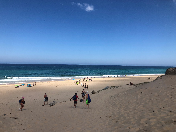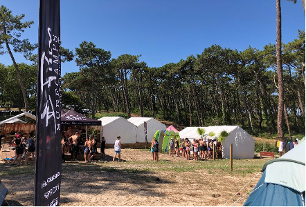 Das Camp liegt hinter Dünen in einem Pinienwald. In den Wäldern wurden Schneisen angelegt, damit sich bei Waldbrand das Feuer nicht so schnell flächendeckend ausbreitet. Auf der Heimreise sahen wir allerdings nahe Bordeaux die ersten Rauchsäulen aufsteigen; nördlich vom Camp sind bereits große Waldflächen dem Feuer zum Opfer gefallen. Entlang der Atlantikküste gibt es am Strand keine Mülleimer, dafür aber strenge Regeln. Campleiter Leon machte uns darauf aufmerksam, dass „Surfer auf ihre Umwelt achten!“ Wir wurden ausdrücklich darauf hingewiesen, keinen Müll am Strand zurückzulassen und Müll mitzunehmen, den andere liegengelassen hatten. Das funktionierte tatsächlich sehr gut und der Strand war extrem sauber. Auf Nachhaltigkeit wird in der Region ebenfalls viel Wert gelegt: ein Shuttle-Bus brachte uns kostenlos vom Campingplatz zu den nahgelegenen Orten. So kann das Verkehrsaufkommen entlang der Küste verringert werden. Im Camp wurde zudem viel Wert darauf gelegt kein Essen wegzuwerfen. Die Teamer gaben das Essen aus und wer nicht satt wurde musste sich erneut in der Essenschlange anstellen und bekam jederzeit Nachschlag.