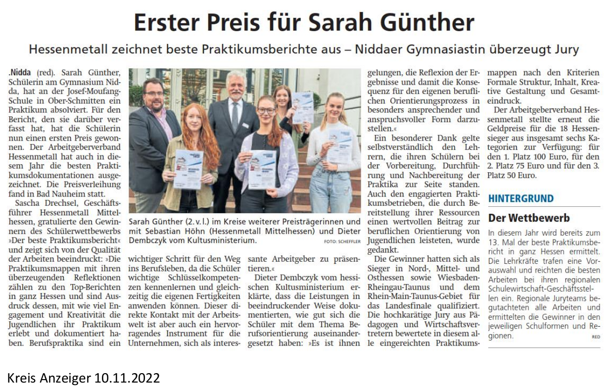 Der Arbeitgeberverband Hessenmetall überreichte Sarah am 02.11.2022 in Bad Nauheim die Urkunde und das Preisgeld (siehe auch Artikel im Kreis Anzeiger: Erster Preis für Sarah Günther - Kreis Anzeiger vom 10.11.2022).
