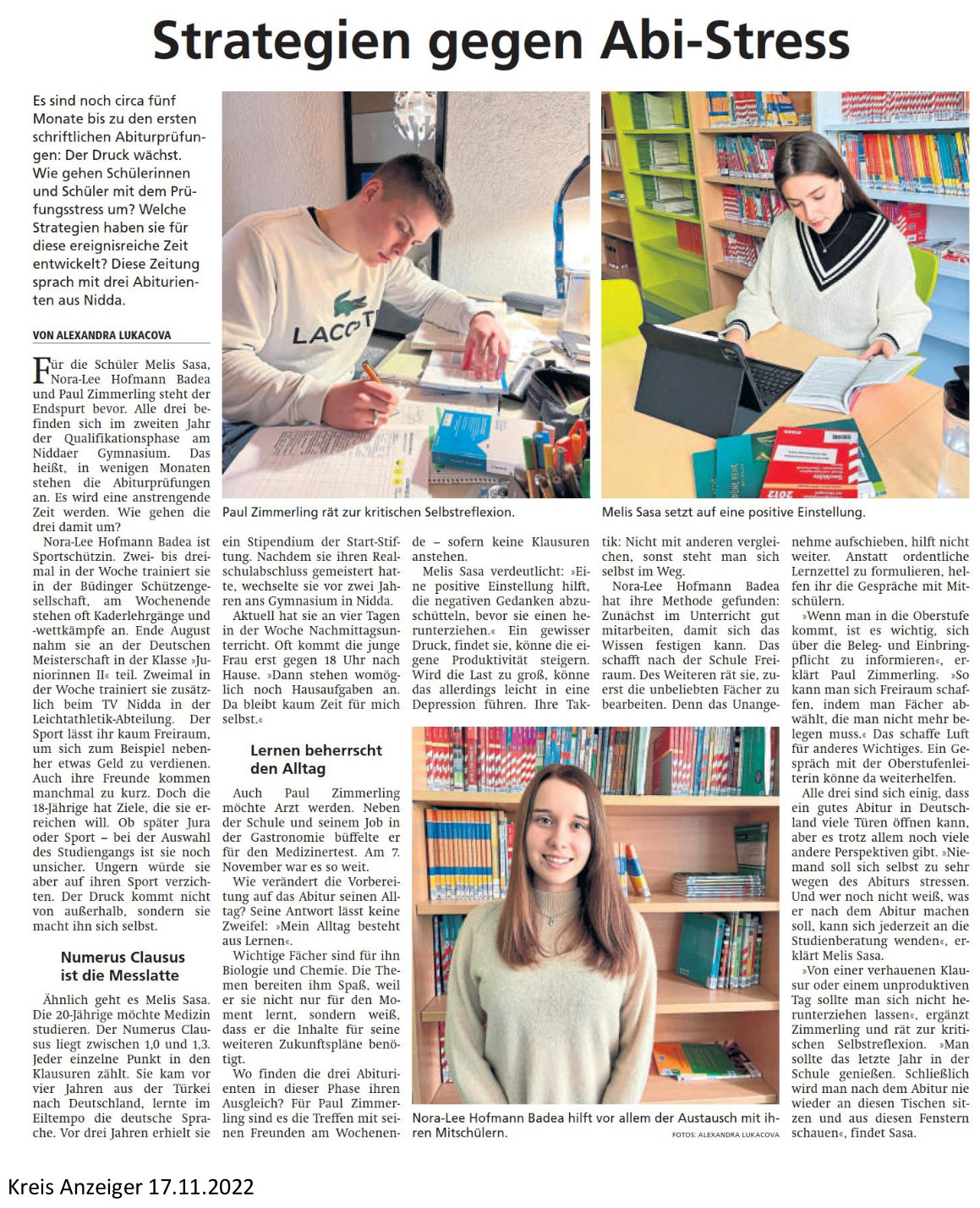 Am 29.09.2022 fand im Bürgerhaus Nidda eine Demokratiekonferenz im Rahmen des Bundesprogramms „Demokratie Leben“ und passend zum Motto „Mobbing? Nicht mit uns“ statt. Das abwechslungsreiche Bühnenprogramm der Veranstaltung umfasste verschiedene musikalische und künstlerische Beiträge, Reden und Vorträge engagierter beziehungsweise ehrenamtlicher Helfer, ein Interview mit der ehemaligen Fußball-Weltmeisterin Nia Künzer und die Verleihung des Titels „Schule ohne Rassismus – Schule mit Courage“ an das Gymnasium Nidda. Ein weiterer Teil des Abends waren verschiedene Thementische und eine Kunstausstellung in Form von Plakaten gegen Rassismus, die im Unterricht des Q3 Kunst Leistungskurses entstanden sind.