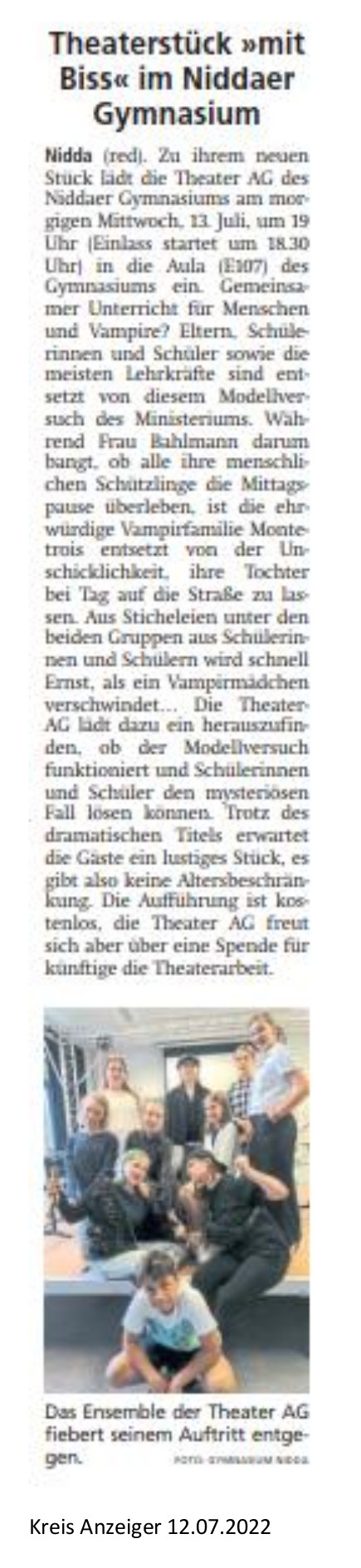 Vom ersten bis zum dritten Juni unternahmen wir, das Schulorchester, der große Chor sowie die Band des Gymnasiums Nidda eine Musikfreizeit nach Erbach zur Vorbereitung auf das Sommerkonzert. Am Morgen des ersten Juni trafen sich alle teilnehmenden Schülerinnen und Schüler auf dem Parkplatz des Schwimmbades, wo der Bus mit Technik aus der Schule, anderem Equipment und dem Gepäck sowie der Instrumente der Mitfahrenden beladen wurde. Die Stimmung auf der Fahrt war angeregt und gespannt, vor allem aber befanden wir uns alle in freudiger Erwartung auf die bevorstehende Zeit.