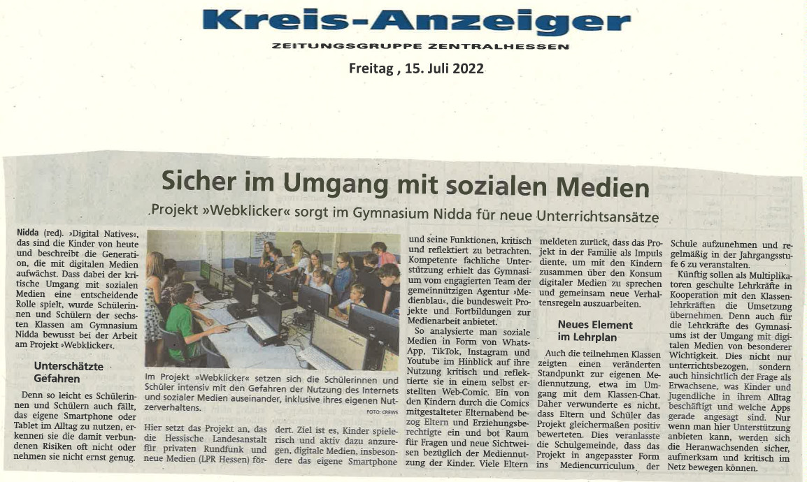 „Digital Natives“, das sind die Kinder von heute und beschreibt die Generation, die mit digitalen Medien aufwächst. Dass dabei der kritische Umgang mit Sozialen Medien eine entscheidende Rolle spielt, wurde den Schülerinnen und Schülern der 6. Klassen am Gymnasium ganz bewusst, als sie gemeinsam das Projekt „WebKlicker“ durchführten. Denn so leicht es den Schülern auch fällt, das eigene Smartphone oder Tablet im Alltag zu nutzen, werden die damit verbundenen Risiken oft nicht erkannt oder ernst genug genommen. Hier setzt das Projekt an, welches von der Hessischen Landesanstalt für privaten Rundfunk und neue Medien (LPR Hessen) gefördert wird. Ziel ist es, die Kinder spielerisch und aktiv dazu anzuregen, digitale Medien, insbesondere das eigene SmartPhone und seine Funktionen, kritisch und reflektiert zu betrachten. Kompetente fachliche Unterstützung erhielt das Gymnasium von dem engagierten Team der gemeinnützigen Agentur „medienblau“, welche bundesweit Projekte und Fortbildungen zur Medienarbeit durchführt. So wurden Soziale Medien in Form von WhatsApp, TikTok, Instagram und YouTube im Hinblick auf ihre Nutzung kritisch analysiert und in einem selbst erstellten WebComic reflektiert. Ein von den Kindern durch die Comics mitgestalteter Elternabend bezog die Eltern und Erziehungsberechtigten aktiv ein und bot Raum für Fragen und neue Sichtweisen in Bezug auf die Mediennutzung ihrer Kinder. Viele Eltern meldeten zurück, dass das Projekt in der Familie als Impuls diente, um mit den Kindern zusammen über den Konsum digitaler Medien zu sprechen und gemeinsam neue Verhaltensregeln auszuarbeiten. Auch in den teilnehmen Klassen zeigte sich ein veränderter Standpunkt zur eigenen Mediennutzung, zum Beispiel im Umgang mit dem Klassen-Chat. Daher war es nicht verwunderlich, dass das Projekt sowohl von den Eltern als auch von den Schülern durchweg positiv bewertet wurde. Dies veranlasste die Schulgemeinde des Gymnasiums Nidda dazu, dass das Projekt in angepasster Form in das Mediencurriculum der Schule aufgenommen wurde und ab nun regelmäßig in der Jahrgangsstufe 6 durchgeführt werden wird. Es ist geplant, dass die Durchführung von als Multiplikatoren geschulten Lehrkräfte in Kooperation mit den Klassenlehrkräften übernommen wird. Denn auch für die Lehrkräfte des Gymnasiums Nidda ist der Umgang mit digitalen Medien von besonderer Wichtigkeit, nicht nur unterrichtsbezogen, sondern vor allem auch hinsichtlich der Frage als Erwachsene, was die Kinder und Jugendlichen in ihrem Alltag beschäftigt, welche Apps gerade angesagt sind. Nur wenn hier Unterstützung angeboten wird, werden sich die jungen Heranwachsenden sicher, aufmerksam und kritisch im Netz bewegen können.