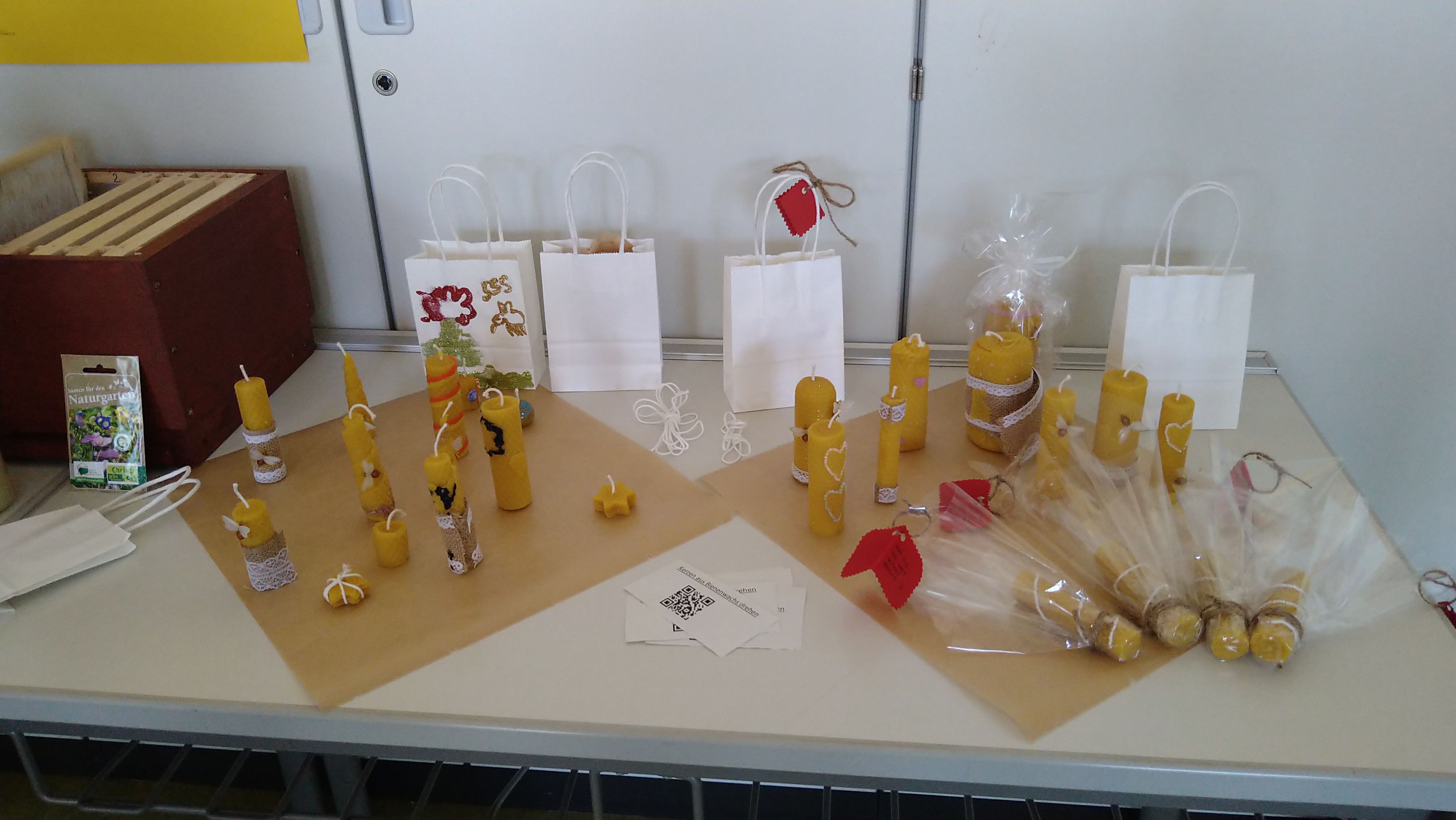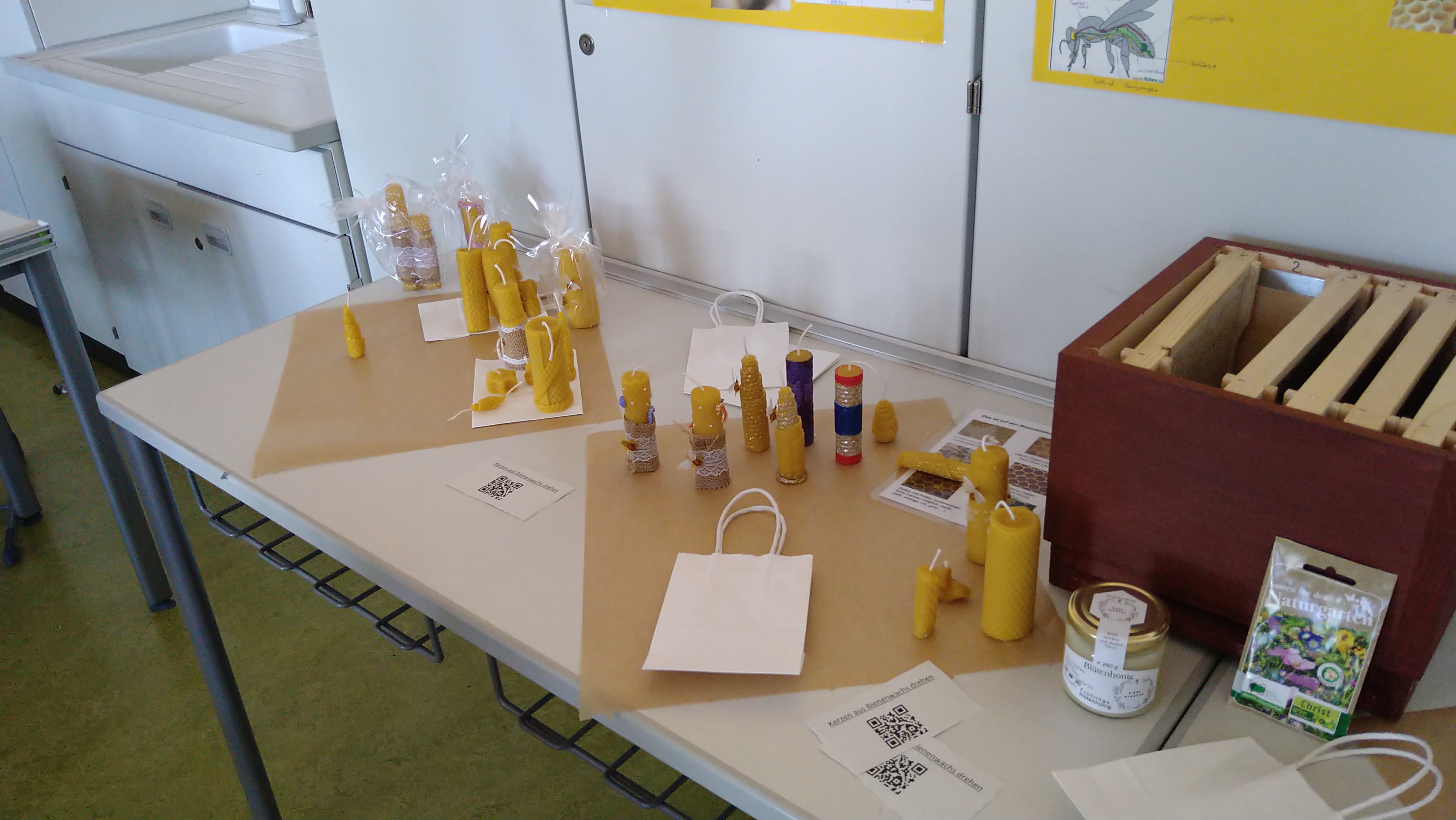In der anschließenden Projektwoche hatten die Schülerinnen und Schüler die Möglichkeit sich in das Projekt „Die Honigbiene als Nutztier“ einzuwählen. Hier wurde der Fokus auf die Bienenprodukte gelegt, wobei Bienenwachskerzen gestaltet und eine Imkerin besucht wurden.