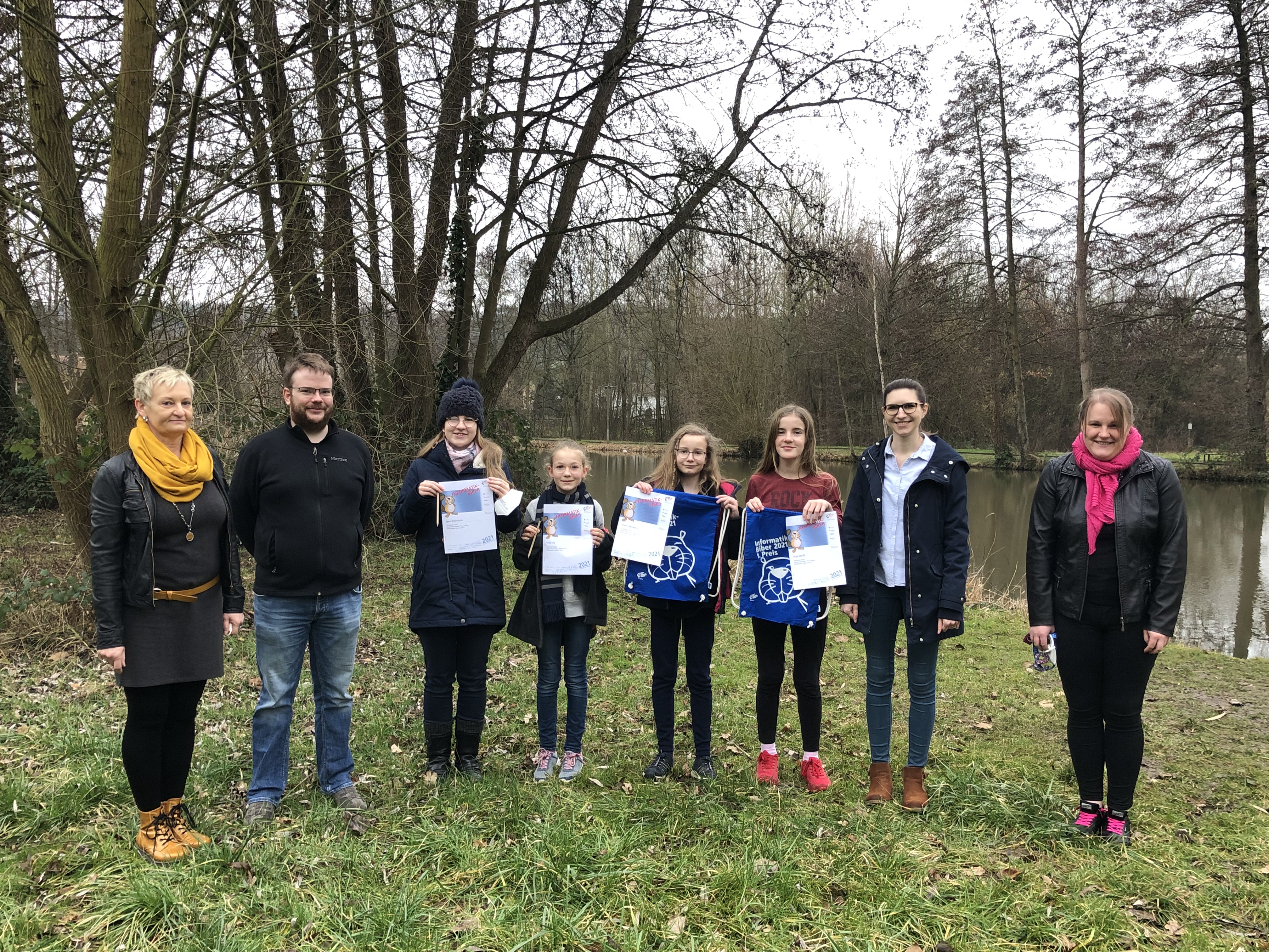 v.l.n.r.: Fr. Heinze (Schulleitung), Hr. Weber (Fachsprecher Informatik), Gesa Liebermann, Frida Zint, Emelie Henneberg, Maja Herold, Frau Neun (Klassenlehrerin 6C), Fr. Schäfer (Aufgabenfeldleitung Naturwissenschaften)