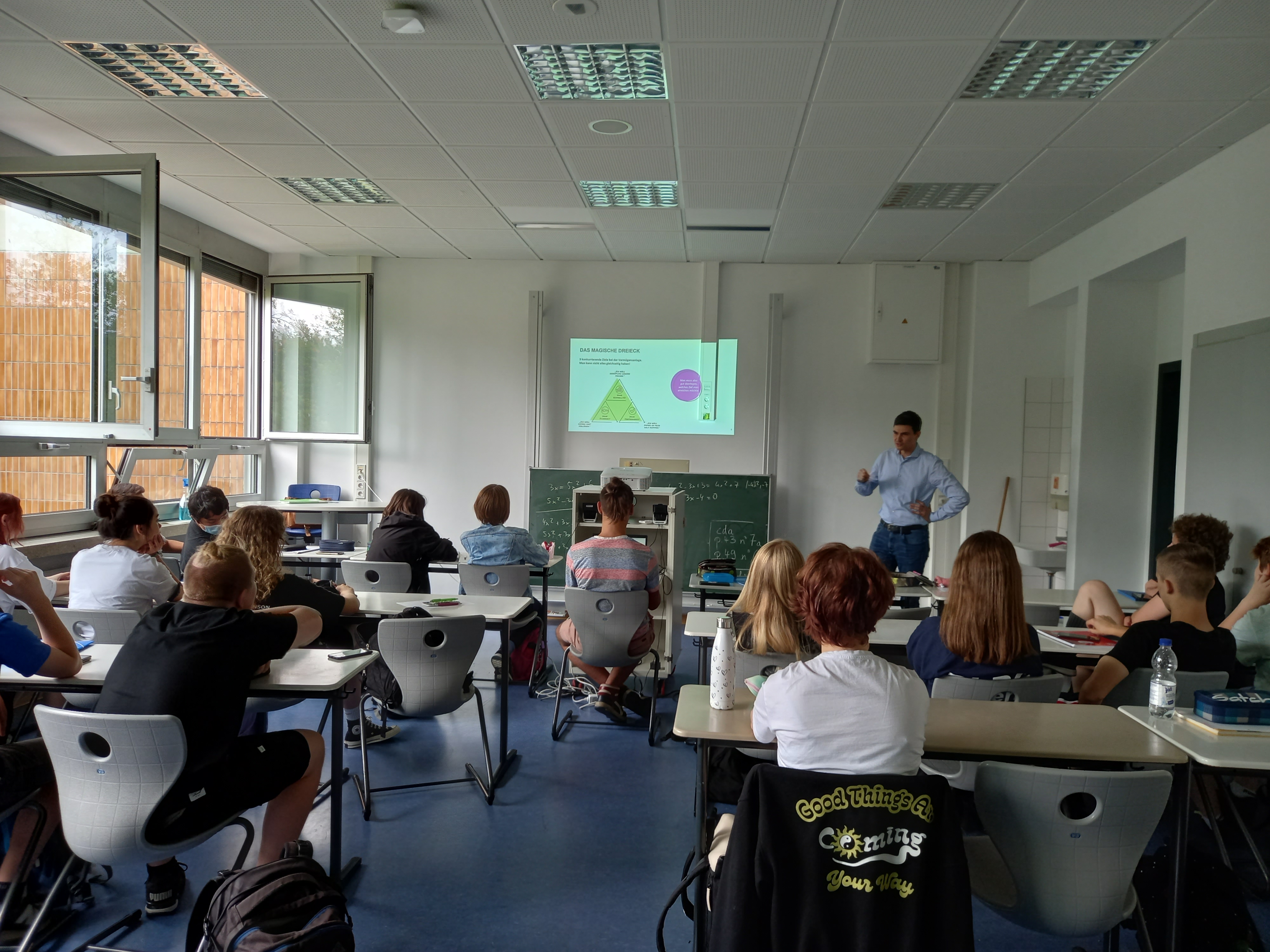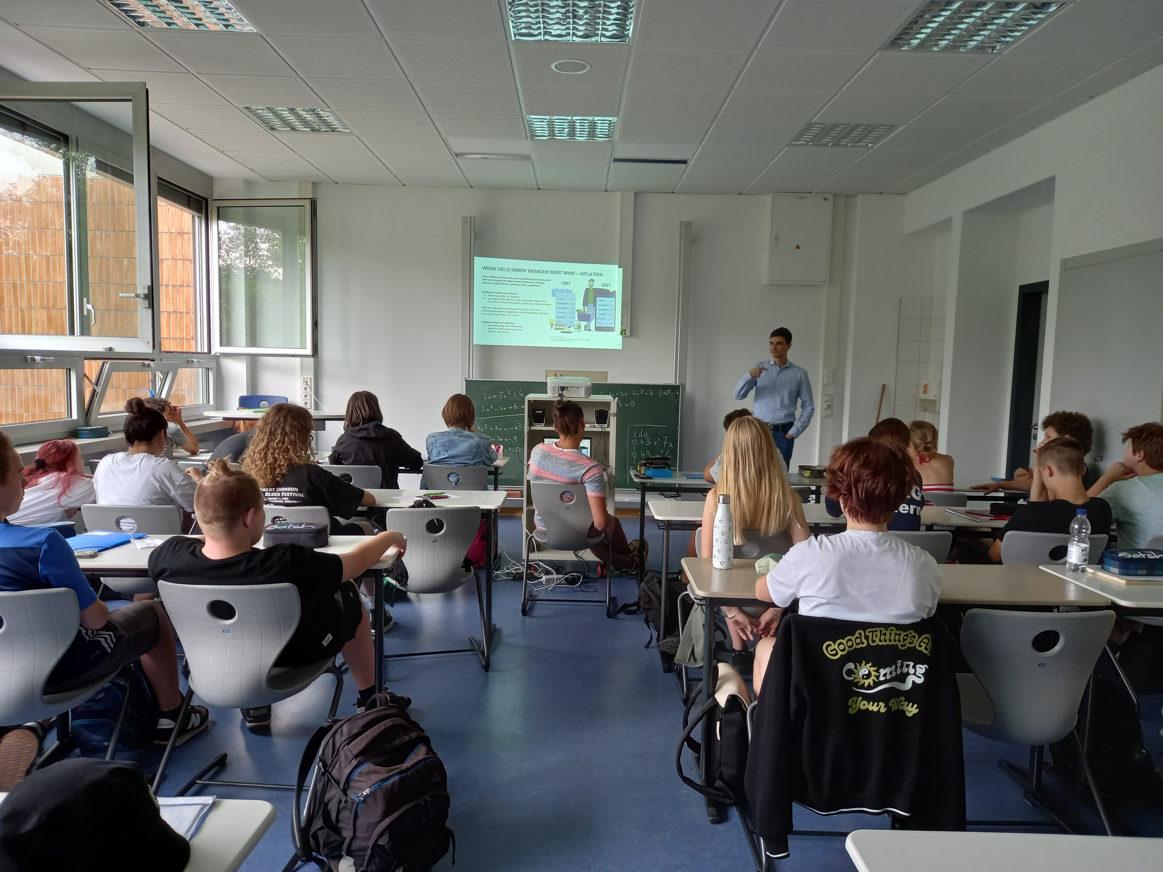 Unter dem Motto „So geht Geld- finanzielle Allgemeinbildung im Unterricht“ referierte Patrick Neugebauer, Mitarbeiter der Deutschen Bank, am 13.07.2022 zu ausgewählten Finanzthemen. So erhielten die Schüler/innen des Q2- Leistungskurses sowie der 9a (beide PoWi bei Frau Hinkel) informative und spannende Einblicke in die Themen „Globales Finanzsystem", „Börse und Co." sowie „Sparen und Anlegen“. Viele Fragen der jungen Schüler konnten so geklärt werden, zum Beispiel: Was bedeutet cleveres Sparen und Anlegen? Wie funktioniert der Wertpapierhandel? Welche Aufgaben haben die Banken? Wie wirkt sich die Zinspolitik auf die aktuelle Inflationslage aus? Ziel des Projektes ist es, Jugendlichen die Angst vor dem komplizierten Thema „Finanzen“ zu nehmen. Neugebauer, selbst ehemaliger Schüler am Gymnasium Nidda, erklärte seine Motivation für diese Vorträge sehr deutlich: „Ich habe in meiner Schulzeit gemerkt, dass wir über solche Themen nur sehr wenig erfahren haben. Einige fühlten sich nach der Schulzeit wirklich ins kalte Wasser geworfen.“ Vor diesem Hintergrund dankte Fachlehrerin Lisa Hinkel für den Vortrag, in dem vor allem für das spätere Erwachsenenleben wichtige, finanzspezifische Themen aufgegriffen wurden.