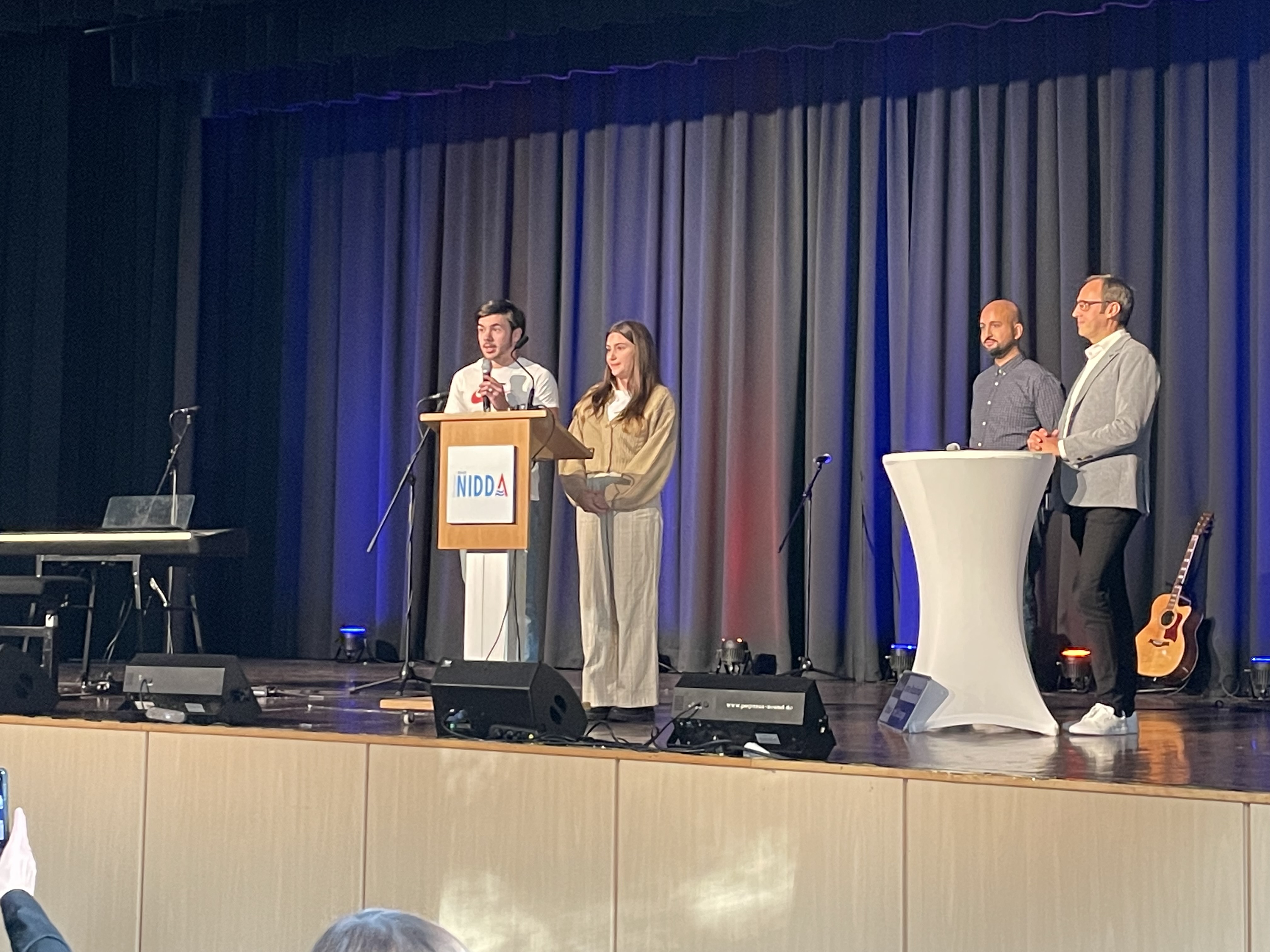 Daraufhin wurde die Verleihung des Titels „Schule ohne Rassismus - Schule mit Courage“ an das Gymnasium Nidda vom Schulsozialarbeiter Marc Lang eingeleitet. Auch die Schülervertretung des Gymnasiums war am Abend zahlreich vertreten. In einer kurzen Ansprache verdeutlichten der Schülersprecher Simon Hergenröther und Melis Sasa, wie wichtig unter anderem freie Wahlen für eine lebende Demokratie sind, wovon in anderen Ländern aktuell nicht die Rede sein könne. Auch die Schulleiterin Alexa Heinze machte in ihrer Ansprache klar, dass Rassismus oft nicht aus Böswilligkeit, sondern aufgrund von Ignoranz und fehlender Toleranz verbreitet wird. Der Titel „Schule ohne Rassismus - Schule mit Courage“ sei nicht nur ein Label, sondern stelle eine Verantwortung für die gesamte Schulgemeinde dar. Die Akzeptanz von Anderssein müsse weiterhin verbreitet werden. Auch die Landeskoordinatorin der Anne Frank Stiftung hieß das Gymnasium, als eine von knapp 3.500 Schulen im Netzwerk, willkommen. Den Abschluss der Verleihung bildete der Chor der Schule mit dem Titel „No!“.