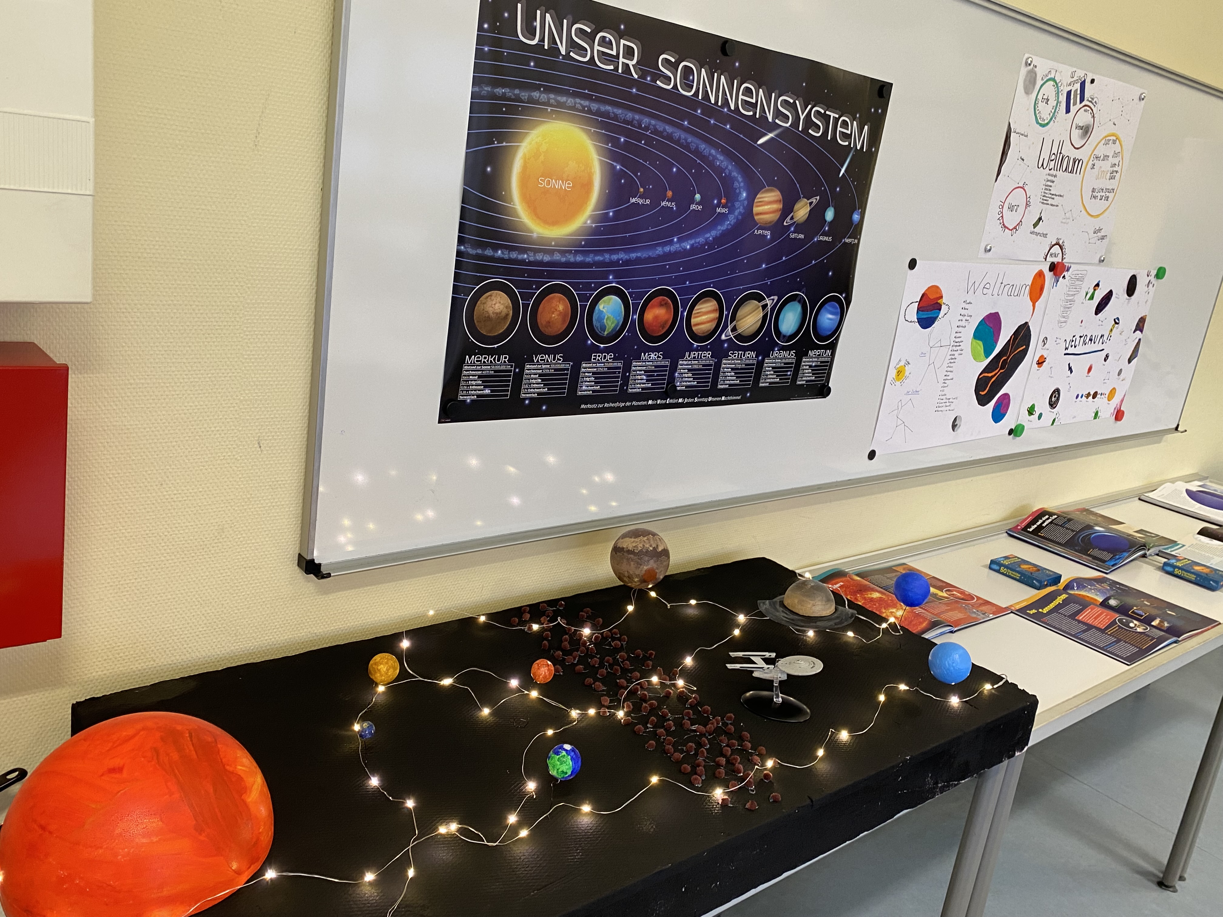 Im Schuljahr 2023/24 war es endlich soweit. Die Astronomie-AG konnte nach einer längeren Planungs- und Vorbereitungsphase endlich für die Jahrgangsstufen 7 und 8 im Ganztagsangebot angewählt werden. Sie richtet sich mit vielen weiteren naturwissenschaftlichen Angeboten aus dem Ganztagsangebot an interessierte Schülerinnen und Schüler, die ihrer Begeisterung für Phänomene aus Natur und Technik nachgehen möchten, und stellt einen weiteren Baustein zur Stärkung des MINT-Profils dar. Dank des Fördervereins, der bereits seit vielen Jahren Projekte der Naturwissenschaften finanziell unterstützt, wurden drei Teleskope inklusive Montierungen und Motoren angeschafft. Die Schülerinnen und Schüler konnten sich bereits mit der Technik der Geräte vertraut machen. Die Präsentation erster Projekte und der Teleskope am Tag der offenen Tür begeisterte sowohl viele Schülerinnen und Schüler aus den Grundschulen als auch deren Eltern. Im aktuellen Schuljahr wird unter anderem in Kooperation mit der Stadt Nidda die Neugestaltung des mittlerweile verblassten Planetenwegs in Angriff genommen.