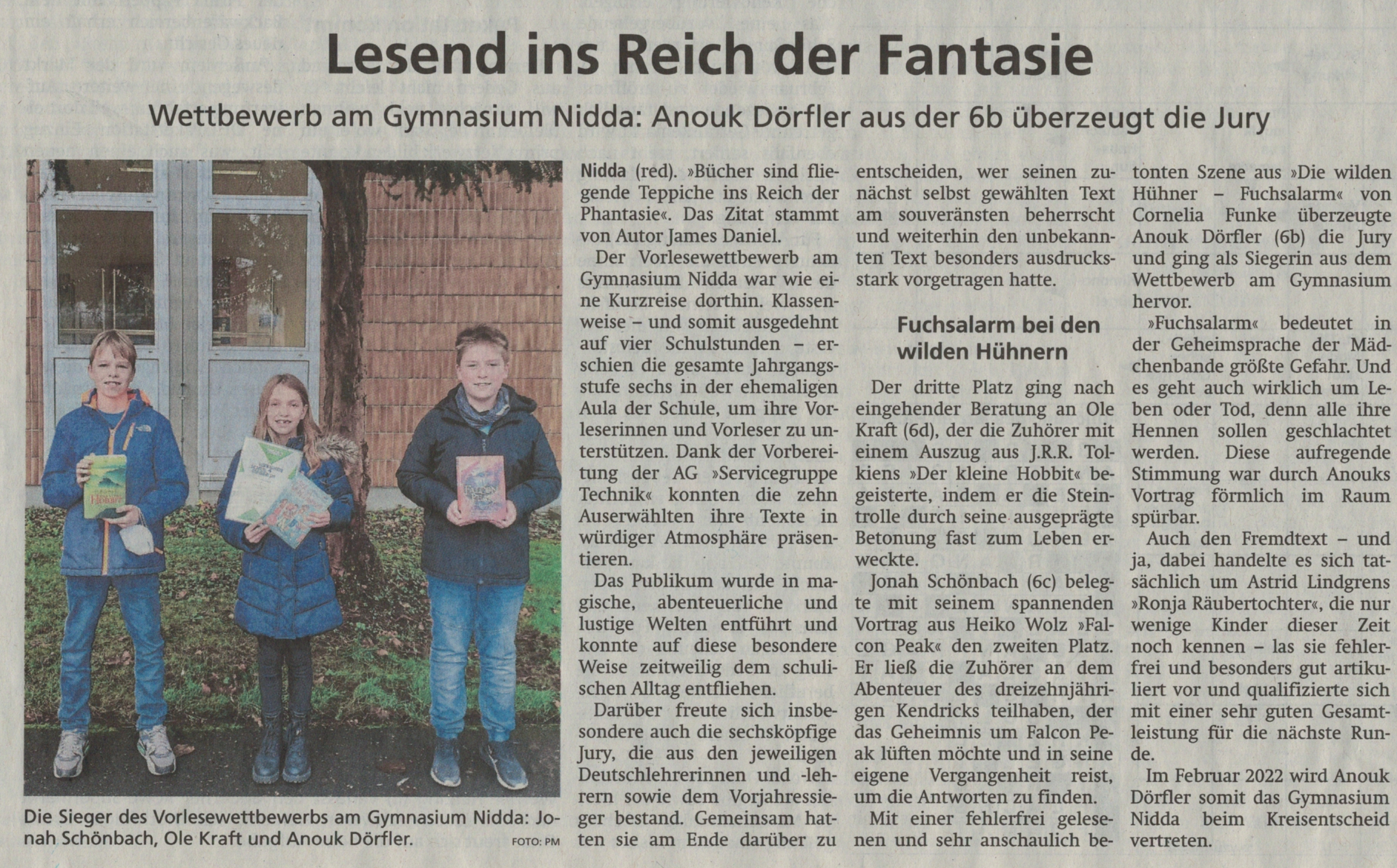 Auch den Fremdtext – und ja, dabei handelte es sich tatsächlich um Astrid Lindgrens „Ronja Räubertochter“, die nur wenige Kinder dieser Zeit noch kennen - las sie fehlerfrei und besonders gut artikuliert vor und qualifizierte sich mit einer sehr guten Gesamtleistung für die nächste Runde. Im Februar 2022 wird sie somit das Gymnasium Nidda beim Kreisentscheid vertreten.